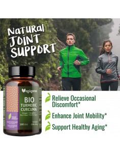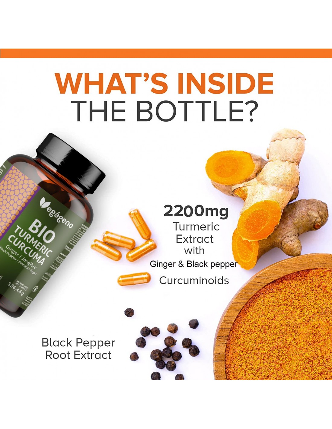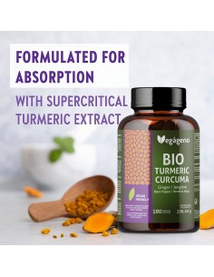 - BIO CÚRCUMA ORGÁNICA , JENGIBRE y PIMIENTA NEGRA: La cúrcuma es una de las especias con más propiedades beneficiosas para la salud. La combinación con Jenjibre y Pimienta Negra (Piperina) proporciona Alta Biodisponiblidad en la absorcion de la Curcumina por nuestro organismo.